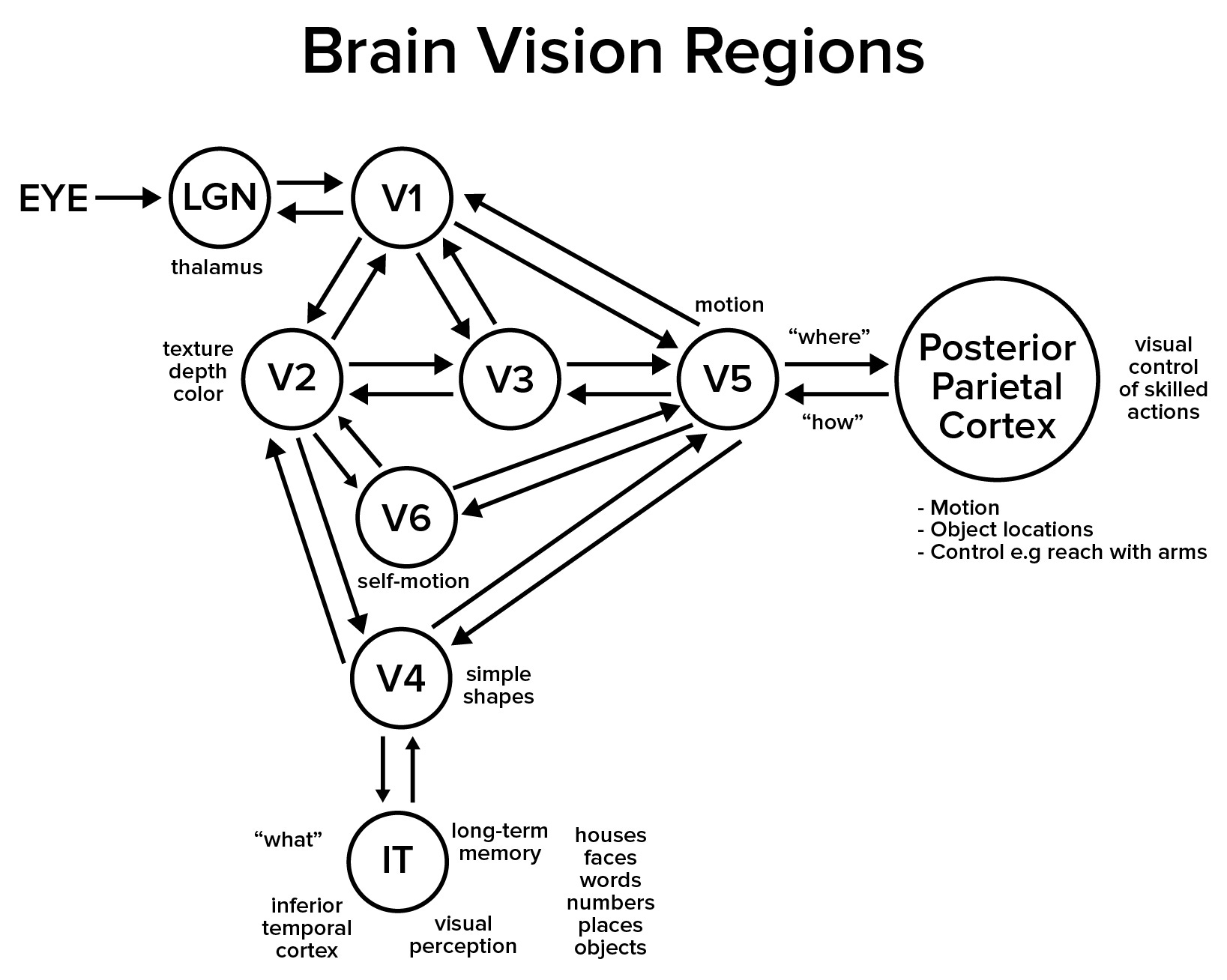 We aren’t talking about the interactions of regions yet, but those regions can signal back to confirm that the patterns make sense in the current context, or that they do not. This is important in theory because top-down and bottom-up recognition have their place in ensuring accuracy and recognizing incomplete patterns.